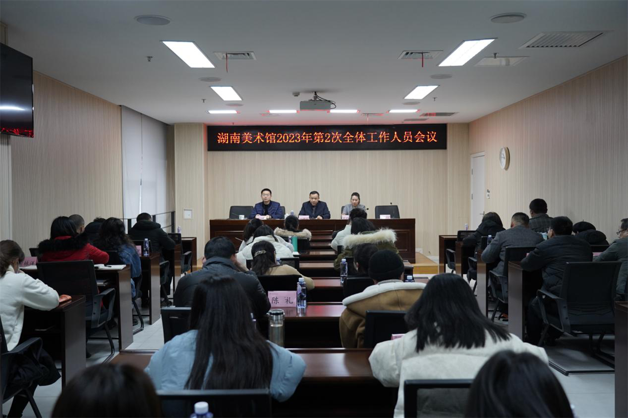 会上,田绍登馆长代表馆领导班子对2023年度重点工作进行了具体部署。他表示,2022年,湖南美术馆取得了较为显著的工作成绩,被评为全省文联系统先进单位。站在2023年的开端,我们要在总结既往的基础上,以更高的政治站位与艺术视野、更强的风险意识与履责标准、更新的工作措施与担当作为,进一步高标准、严要求,精益求精,团结奋进,力争再登新高,再创佳绩。做好接下来的工作,要着重从以下三个方面发力:一是扛牢政治责任,进一步统筹抓好安全与发展;二是加强团结引领,进一步建设高素质干部队伍;三是敢于担当作为,进一步推进工作迈上新台阶。