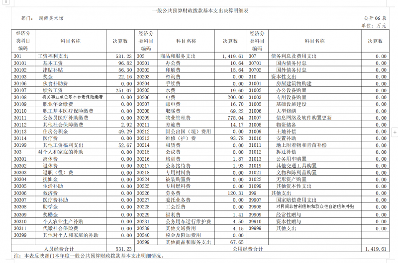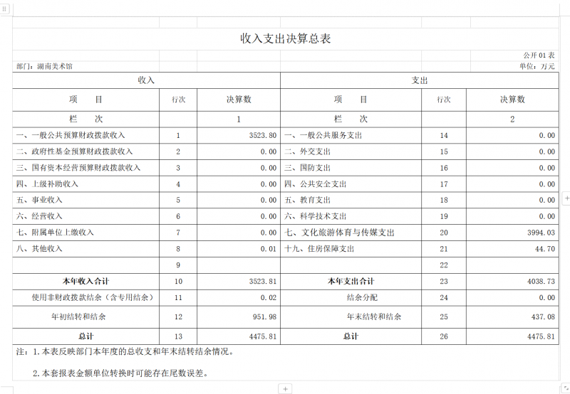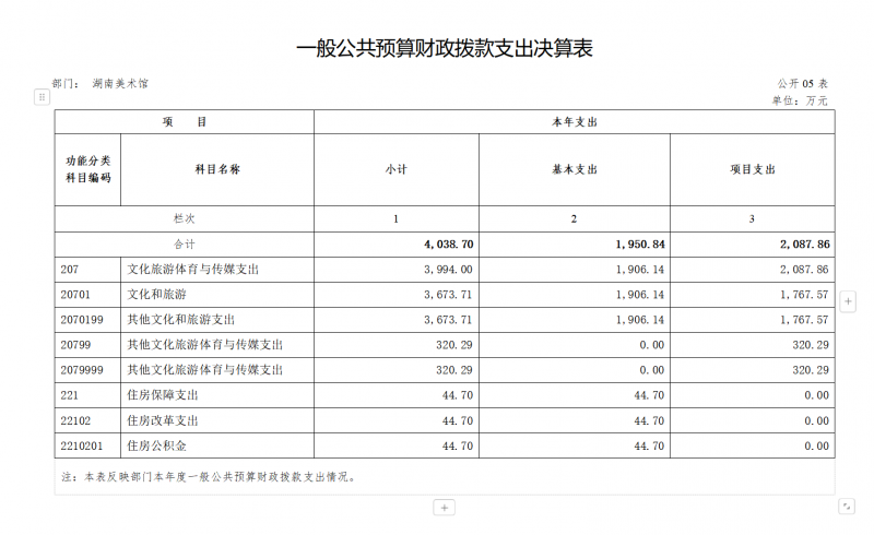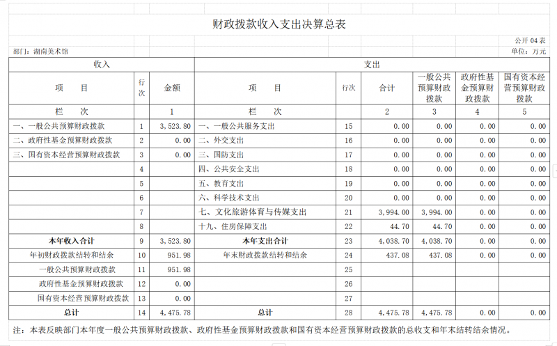湖南美术馆2023年度预算合计4475.81万元,包括上年结余结转951.98万元,2023年批复年初预算3152.08万元,年中追加371.75万元(其中:中央补助地方公共文化服务体系建设资金及奖励资金200万元,人员经费171.72万元,公用经费0.03万元);2023年度总支出4038.73万元;2023年度结余资金437.08万元。